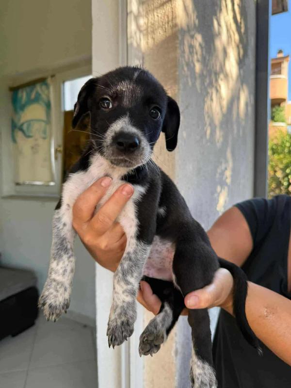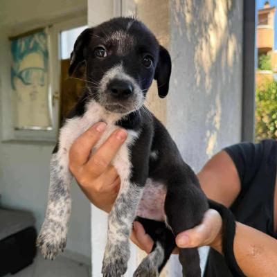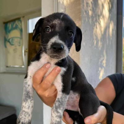 Crno bijeli slatkiš legla s najsladim okama i prijateljskim stavom. Zaigran je, veseo, znatiželjan i sve ono što štene treba biti. U novi dom stiže veterinarski obraden sukladno dobi.