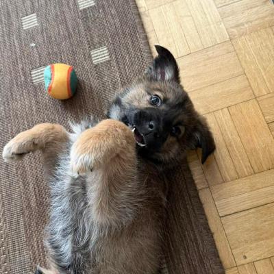 Mora je mješanka od cca 3mj. Pravo je zaigrano, veselo i znatiželjno štene. Roditelji su nam nepoznati što znači da rast u odrasloj dobi ne možemo znati. Ali svakako znamo već sada da je divna pesica.