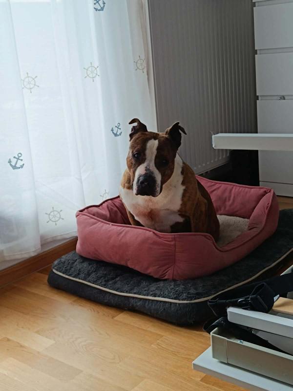 Gospodična Zuma traži svoj Zauvijek dom! Curka ima oko 8god, srednjeg je rasta, ima oko 30ak kg. Mora na laganu dijetu da skine višak. U tipu je terijera bull. Velika je maza i šarmerica. Voli se ustati iz kreveta samo kada je vrijeme za klopanje.